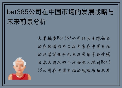 文章摘要:Bet365公司,作为全球领先的在线博彩平台,近年来在中国市场的运营策略和未来发展前景备受瞩目。本文将从四个方面深入探讨Bet365公司在中国市场的战略布局及其未来发展机遇。首先,文章将分析Bet365在中国市场的现状及市场潜力,探讨中国庞大的消费者基础与日益增长的博彩需求对Bet365的吸引力;其次,本文将讨论Bet365的产品本地化战略及其如何适应中国独特的文化和法律环境;接下来,文章将分析Bet365在中国市场的竞争态势,包括面对的主要竞争对手与应对策略;最后,本文将展望Bet365未来在中国市场的发展前景,探讨其可能的挑战和机遇。通过对这些方面的详细分析,本文旨在为读者提供一个全面的视角,帮助理解Bet365公司在中国市场的发展战略及其未来的可能走向。
