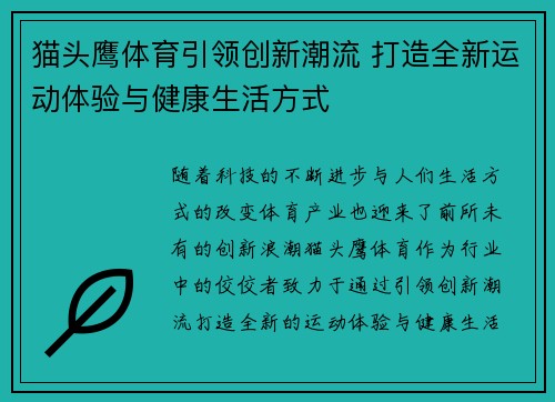 通过上述分析,猫头鹰体育在引领创新潮流、打造全新运动体验与健康生活方式方面,已经取得了显著成就。从技术创新到用户体验的升级,从健康管理到社会责任的践行,猫头鹰体育的每一项举措都在推动着行业的变革,并且深刻影响着全球消费者的运动生活方式。